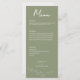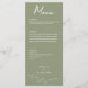 Este Menu Formal Elegante de Sage Green Floral apresenta flores delicadas em um fundo verde sábio, com tipografia moderna e caligrafia de script. Ele é totalmente personalizável com os nomes dos casais, data do casamento, opções de menu para cada curso e espaço para outras informações no lado oposto. A design formal e o texto vão adicionar um toque de elegância à sua celebração de casamento.