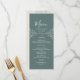 Elegante, moderno, boho, vintage, cardápio de casamento verde com corda prateada e um lugar floral dourado.