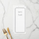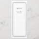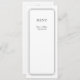 Design apresenta design branco e preto limpo e clássico, o que o torna minimalista e elegante. Ele apresenta uma simples borda de linha dupla com detalhes de canto redondo que enquadram o layout. No verso está uma forma oval, o dentro é um 2 monograma do casal com o menu detalhado escrito em roteiro de caligrafia formal.