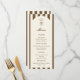 Birthday menu card featuring a hand-drawn coffee martini glass and coffee beans paired with elegant script and serif fonts in which your personalized information is written. The background is brown stripes on a light background. Check out our store for more items from this collection.