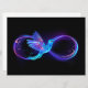 Símbolo luminoso, roxo e infinito com beija-flor azul voadora, luminosa, em fundo preto. Neon.