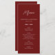 Este cartão moderno e minimalista de recepção de casamentos outono oferece um esquema simples e limpo num fundo burgundy. O design oferece espaço para você adicionar seus itens de menu de recepção de casamento junto com os nomes da noiva e do noivo e a data do casamento.