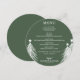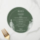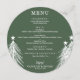 Um cardápio de jantar redondo elegante e sempre-verde com árvores de Natal brancas apresenta os detalhes do seu cardápio em letras sofisticadas. Perfeito para uma festa de Natal ou qualquer evento especial com jantar sentado.