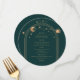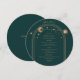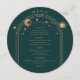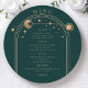 Mística Verde Verde Dourada Sol Lua Estrelas Espaciais Cartões de Menu de Casamento Apresenta um raio sol dourado, lua e estrelas sobre um fundo verde com os seus detalhes cardápios no centro em um moderno roteiro de caligrafia dourada. Personalize editando o texto nas caixas de texto fornecidas. Projetado para você pelo Evco Studio © em www.zazzle.com/store/evcostudio