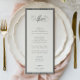 STATELY CALLIGRAPHY, black onyx and soft ecru, wedding menu. Features, elegant black calligraphy and serif typography and stripe pattern frame detail. Colors can be customized by using the design tool feature.
