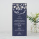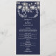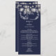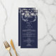 Apresentando bonito luzes de cordas e ilustrações com desenho manual floral rústico, personalize este menu azul de marinho com as suas informações especiais do menu do dia do casamento. Projetado por Thisnotme©
