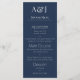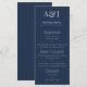 Este cardápio de casamento elegante e moderno apresenta um fundo azul-marinho. Duas iniciais de exemplo são impressas na parte superior em uma fonte cinza-claro. Você pode personalizar o cardápio para incluir suas próprias iniciais e opções de comida personalizadas. A parte inferior do cardápio apresenta três pratos com duas opções cada. Você pode substituir os itens do cardápio pelas opções de comida de sua escolha. O verso do cardápio é da cor azul-marinho correspondente. É adequado para eventos de café da manhã, brunch, almoço ou jantar.