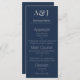 Este elegante e moderno menu de casamento apresenta um fundo azul marinho. Duas iniciais de amostra são impressas na parte superior de uma fonte de cinza pálida. Você pode personalizar no menu para incluir suas próprias iniciais e opções de comida personalizadas. A parte inferior do menu apresenta três cursos com duas opções cada. Pode substituir os elementos do menu pelas opções de comida da sua escolha. A parte traseira do menu é uma cor azul do marinho correspondente. É adequado para o café da manhã, almoço, almoço ou eventos de janto.