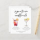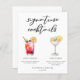 Esta folha de papel de cardápio de coquetéis de assinatura gráfica apresenta tipografia preta personalizada acima de 2 bebidas e seus ingredientes para seu bar de casamento. Um bonito desenho de Martini Shirley Temple e Lemon Drop, suja, adiciona um talento legal ao menu do seu bar. Preencha com os nomes dos casais e a data para sua recepção.