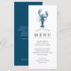 Menus de comida personalizados com tema de Lomba Azul para a sua próxima Festa de Lomba Assada ou evento de frutos do mar. Ele apresenta uma ilustração em estilo aquarela de uma lagosta azul. Por baixo, há espaços para as informações do menu do seu evento.