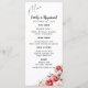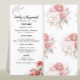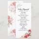 Este cartão de menu de casamento elegante apresenta uma estética botânica sofisticada que equilibra o romance tradicional com um layout limpo e moderno. É uma escolha perfeita para casais que buscam um visual refinado e atemporal para as mesas de recepção. O lado direito é adornado com um delicado buquê em aquarela de peônias suaves em rosa e branco, acentuado por bagas vermelhas escuras e folhas em estilo eucalipto azul-acinzentado.