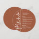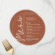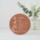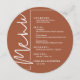 Um cartão de menu de jantar de terracota redondo apresenta suas opções de menu em letras brancas elegantes, perfeito para um casamento moderno, jantar de ensaio de casamento, festa de aniversário ou qualquer evento especial com jantar sentado. Personalize facilmente com o seu cardápio e detalhes. MAIS cores em nossa loja.