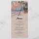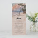 Cartões de cardápio de destino de praia, com um cenário romântico de praia tropical por pôr do sol, com palmeiras exuberantes, luzes cintilantes de cordas e um modelo de opção de menu.
