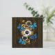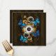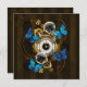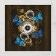 Composição do relógio de aço redondo com discagem numérica romana preta, decorado com engrenagens de ouro e latão, borboletas morfo azuis e lentes danificadas sobre fundo listrado castanho. Estilo Steampunk.