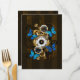 Composição do relógio de aço redondo com discagem numérica romana preta, decorado com engrenagens de ouro e latão, borboletas morfo azuis e lentes danificadas sobre fundo listrado castanho. Estilo Steampunk.