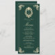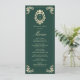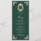 Cartão de cardápio elegante em verde esmeralda com ouro barroco ornamentado floresce e um monograma vitoriano regal no topo. Esta design luxuosa oferece espaço para mostrar seus cursos de janto de casamento em um layout formal e sofisticado. Coordena-se perfeitamente com a suíte de convite para casamento esmeralda verde e barroco-ouro, ideal para casais planejando uma celebração clássica, elegante e eterno.
