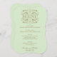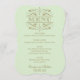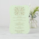 Cartões elegantes e formais de janto de casamento apresentam espirais decorativas e floresces que moldam a design. inspirada na safra. Pistão verde e cores antigas de ouro. Personalize com os nomes da noiva e do noivo, data do evento e detalhes do menu.