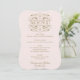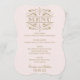 Cartões elegantes e formais de janto de casamento apresentam espirais decorativas e floresces que moldam a design. inspirada na safra. Cor rosa pálido e dourado antigo. Personalize com os nomes da noiva e do noivo, data do evento e detalhes do menu.