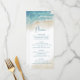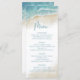 This elegant summer coastal destination wedding reception menu card features a hand painted watercolor beach scene in the corner with ocean waves lapping on the sea shore.