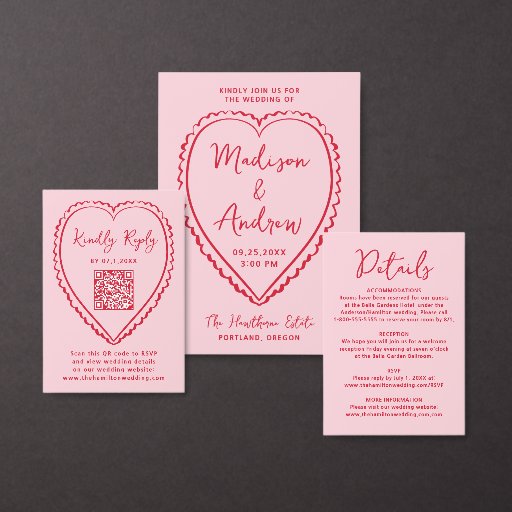 Share your reception menu in style with this whimsical wedding menu card designed to coordinate with modern and playful wedding stationery. The front of the menu features “Menu” displayed in a handwritten red script with your wedding menu details shown below on a pink background, making it a charming addition to place settings or reception tables. The back of the wedding menu card features a hand-drawn pink heart surrounding the couple’s names and wedding date for a cohesive and personalized look. Perfect for Valentine’s weddings, February weddings, and romantic celebrations, this customizable wedding reception menu adds personality while helping guests easily view the menu at your reception.