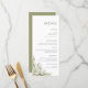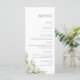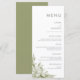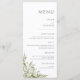 Este elegante cardápio de casamento apresenta um arranjo florescente de flores brancas e verde num fundo de linho branco nítido. Usando a tipografia sans serif e sutis pistas da caligrafia manuscrita, esta design é moderna e clássica.