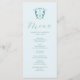 Este elegante cardápio de casamento apresenta uma simples crista monográfica com a noiva e as iniciais do noivo. A palavra "Menu" é definida em script de caligrafia. Use os campos modelo para adicionar seus itens de menu personalizados em turquesa sobre um fundo azul pálido. Perfeito para casamentos, janto de ensaio, festas de noivado e muito mais.