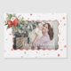 This fun and festive holiday template features a cute coral red coquette watercolor bow with white polka dots, ivory rose and pine, wavy coral ribbon frame, custom Merry Christmas calligraphy graphic and a one-photo landscape-aspect template on a pastel polka dot background.