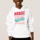 Retro typography in pink, red and teal stacked letters spell Merry Christmas with playful star accents, ideal for festive apparel and holiday gift prints.