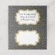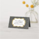 Placa de lugar dobrada de cinza de quadro com fundo de bolinhas dourado. Gráficos de uma placa de texto dourada, na frente está pronta para personalizar manualmente para cada convidado no seu casamento. A parte traseira do cartão tem a mesma placa dourada com texto preto personalizado pronto para você mudar para ler o que você quer.