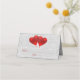Avise aos hóspedes onde eles estarão sentados com um cartão de recepção de casamento dos Balões do Coração Vermelho. A placa de lugar design apresenta um par de balões cardíacos sobre um delicado fundo de damasco de rendas. Material adicional disponível com esta design também.