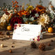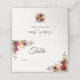 Adicione um toque de elegância rústica à sua configuração de mesa com estes cartões de lugar dobrados, projetados com rosas de madeira bornu, dahlias laranja queimadas, verde de eucalipto e folhas de outono de ouro. Perfeito para casamentos, chás de panela, jantas de Ação de Graças e outras celebrações do outono. Personalize com nomes de convidados e números de tabelas para criar uma atmosfera quente e convidativa para o seu dia especial.