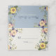 Cartão de casamento elegante, moderno, boho, rústico, botânico, azul empoeirado com nome e número de mesa, flores a aquarelas, girassóis e verde.
