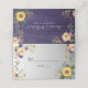 Cartão de lugar de casamento roxo de madeira rústica botânica moderna e elegante, boho, com nome e número da mesa, flores de aquarela, girassóis e folhagens.