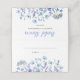 Cartão de lugar dobrado para chá de panela de noiva floral azul. Desenho elegante de flores silvestres em aquarela. Fácil de alterar o texto.