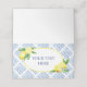 Use este lindo cartão dobrado italiano de azulejo azul limão para o seu evento como tendas de comida, cartões de lugar, tendas de atividade e muito mais. Com um estilo toscano de Positano, é perfeito para qualquer evento de primavera ou verão.