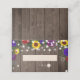 Cartões russos de acompanhantes de casamento com girassóis vibrantes, dahlias, hálito de bebê e samambaias formam uma bela paleta de amarelos, vermelhos e roxas de inverno contra um fundo chic de madeira escura com luzes de cordas. Perfeito para casamentos rústicos, casamentos de celeiro.