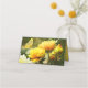 Cartão de lugar dobrado Elegante com fotografia de flores amarelas e borboleta amarela como fundo. A dentro da placa de lugar é feita em amarelo sólido. Uma área de texto retangular branca semitransparente, na frente da placa, está pronta para personalizar manualmente, para sua recepção de casamento.