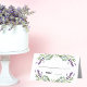 Um moderno e elegante. Um fundo branco decorado com flores de lavanda, flores e verde de eucalipto. Personalize e seus nomes. Adicione seus nomes de convidados e seu número de tabela manualmente.