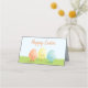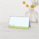 Colocar cartão com três caracteres de ovo de Páscoa, sorridentes. As personagens e a grama verde estão na frente e no verso do cartão de lugar. A parte traseira desta placa de lugar tem versões maiores da ilustração e das palavras. As palavras "Felz pascoa" são personalizáveis.