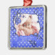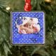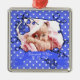 Novo ornamento de fotos de menina nascer. Foto de menina, primeira, sobrenome e data de nascimento, floral azul de espiral e bolinhas.