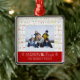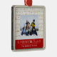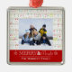 Este ornamento quadrado superior do feriado do Natal do metal tem um fundo colorido da folha de música da canção do Natal com uma beira inferior vermelha. No meio, você pode adicionar sua fotografia da família. Debaixo da imagem, alegre e brilhante é escrito entre dois ornamento brancos. Na parte inferior, você pode facilmente personalizar este com seu nome de família.