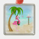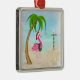 Ornamento de férias com tema de feriado tropical. Design apresenta flamingo cor-de-rosa com chapéu e coroa de Papai Noel, palmeira e sigla do Polo Norte em fundo de praia. Um presente perfeito para aqueles que celebram os feriados em climas quentes.Gráficos http://www.delightful-doodles.com/