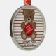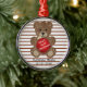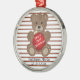 Comemore o primeiro feriado do bebê com este adorável ursinho de pelúcia, ornamento cerâmico. Colocado contra um fundo listrado de cana doce é este urso fofinho marrom. O urso está segurando ornamento vermelho que diz "O Primeiro Natal do Bebê". Você pode personalizar este texto. Embaixo do urso há uma área para um nome e uma data.