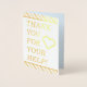 Este design de cartão de obrigado de folha de dourada, arrojado, apresenta a mensagem "OBRIGADO POR SUA AJUDA!" na frente, juntamente com uma mensagem personalizada no dentro. Pode ser usado para mostrar apreço a alguém que fez um ato especial.