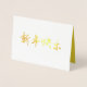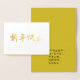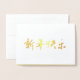 Cartão de Ano Novo chinês "Feliz ano novo" requintado na caligrafia dourada moderna, com saudações auspiciosas no dentro do cartão.