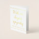 Este design de cartão de simpatia por folha de ouro personalizado e elegante apresenta a mensagem "Com a nossa mais profunda simpatia" à frente, juntamente com uma mensagem personalizada no dentro. Um cartão como este poderia talvez ser utilizado para oferecer condolências aos familiares de alguém que morreu recentemente.