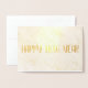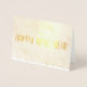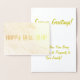 Cartão de Feliz Ano Novo com mensagem no interior em texto dourado. As imagens são em folha de ouro real e você pode personalizá-las, assim como o texto em ouro.