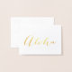 Cartões tropicais de papelaria apresentam a saudação havaiana "Aloha" em um roteiro de caligrafia moderna em folha de ouro. dentro vazio.