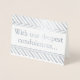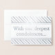 Esta design de cartão de saudação personalizada, de folha prateada, apresenta a mensagem "Com as nossas mais profundas condolências..." na frente, juntamente com uma mensagem personalizada no dentro. Talvez pudesse ser usada para oferecer simpatia a alguém que sofreu mal a fortuna.