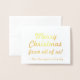Esta design de cartão de saudação de Natal em folha de ouro personalizável apresenta a mensagem "Feliz Natal de todos nós!" na frente, juntamente com uma mensagem personalizada no dentro. Pode ser enviado para amigos e família em celebração ao Natal.